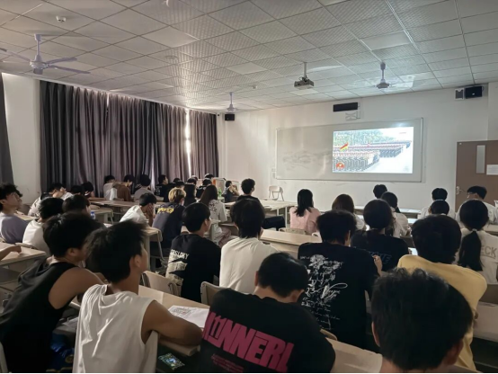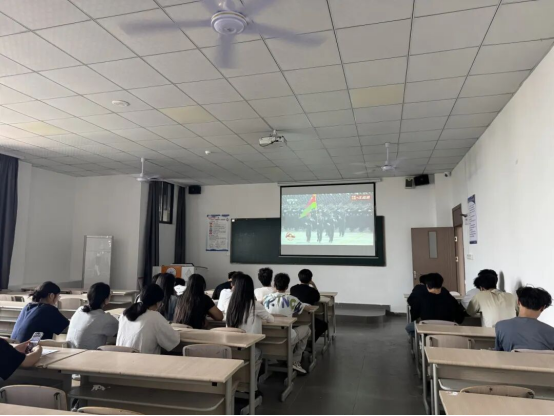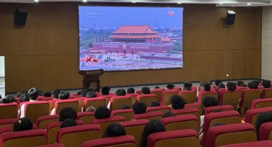 在学术报告厅,师生们早早地就来到现场,整齐就座,等待阅兵式的开始。当阅兵式正式开始,雄伟的国歌奏响,全体师生起立,怀着崇敬的心情唱国歌,目光紧紧地聚焦在大屏幕上。在科智楼的各教室,辅导员们组织其余学生有序观看,教室里秩序井然,同学们都被阅兵式的宏大场面所吸引。