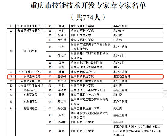 6月19日,重庆市职业技能鉴定指导中心公布了建立重庆市技能技术开发专家库的结果,yl6809永利官网人工智能与大数据学院院长王俊峰教授入选“大数据系统运维”职业(工种)专家库。