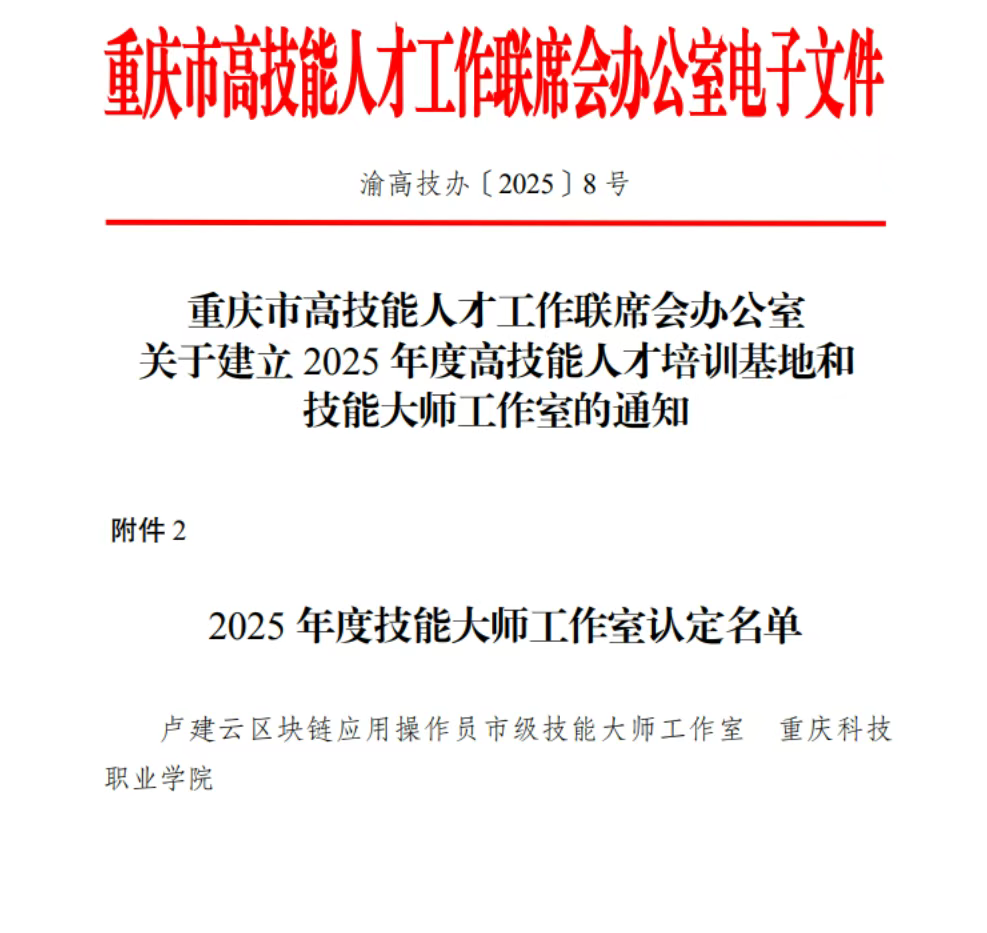 喜讯传来!见“渝高技办〔2025〕8号”通知。在2025年重庆市技能大师工作室申报中,我校卢建云(客座教授)博士的“卢建云区块链应用操作员市级技能大师工作室”申报课题中脱颖而出。此次从200多项申报课题中仅遴选30项,授予重庆市大师工作室立项称号。