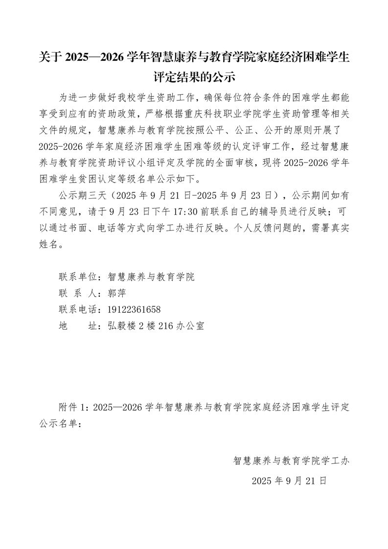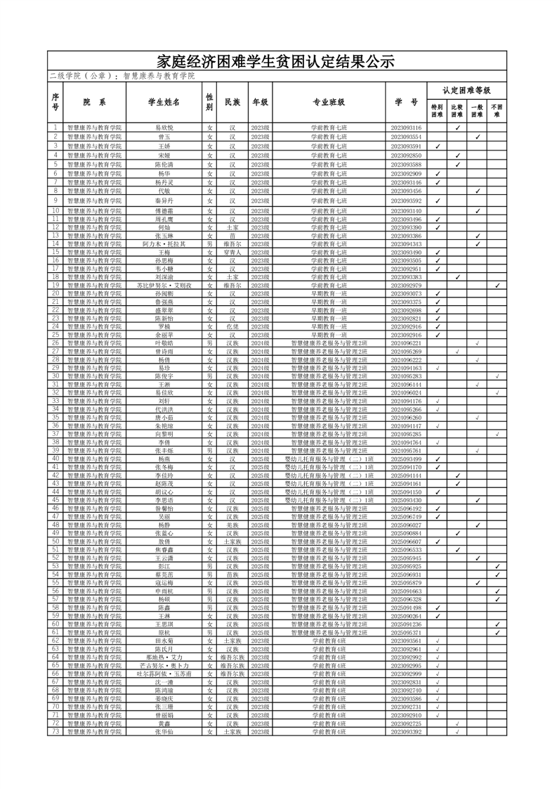 关于2025—2026学年智慧康养与教育学院家庭经济困难学生评定结果的公示