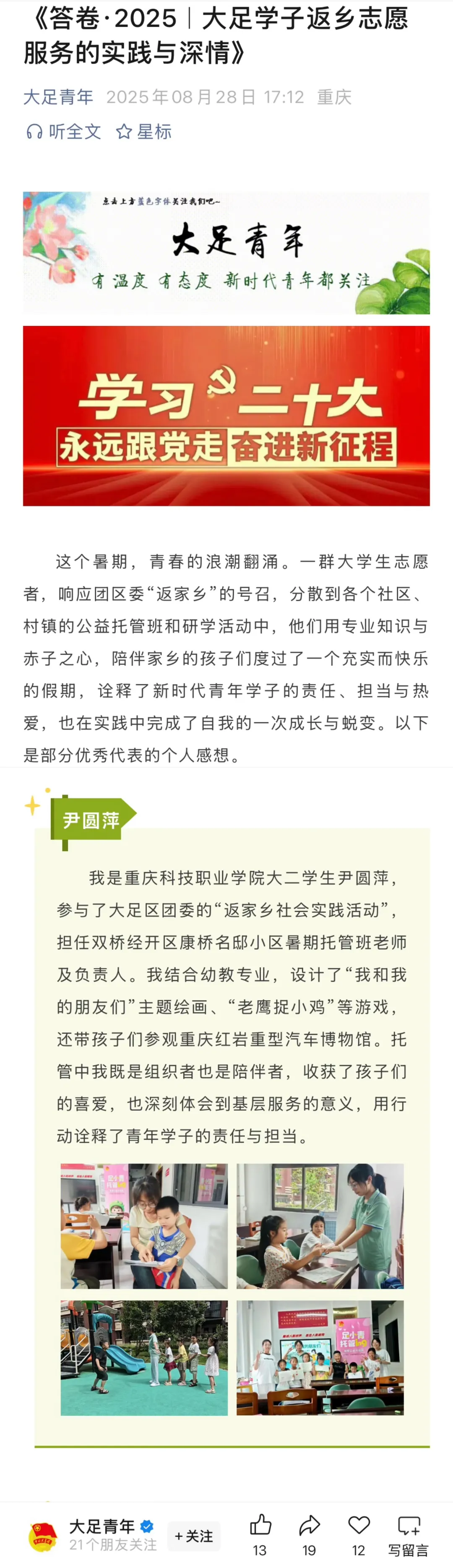 青春返乡践担当,学子实践绽光芒丨我院学子“返家乡”活动获大足青年报道